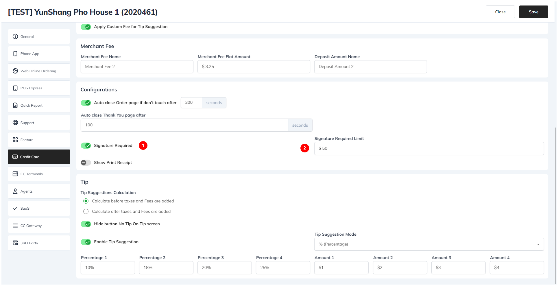 - In the Configurations section, check the Signature Required checkbox and enter a value in the Signature Required Limit field.