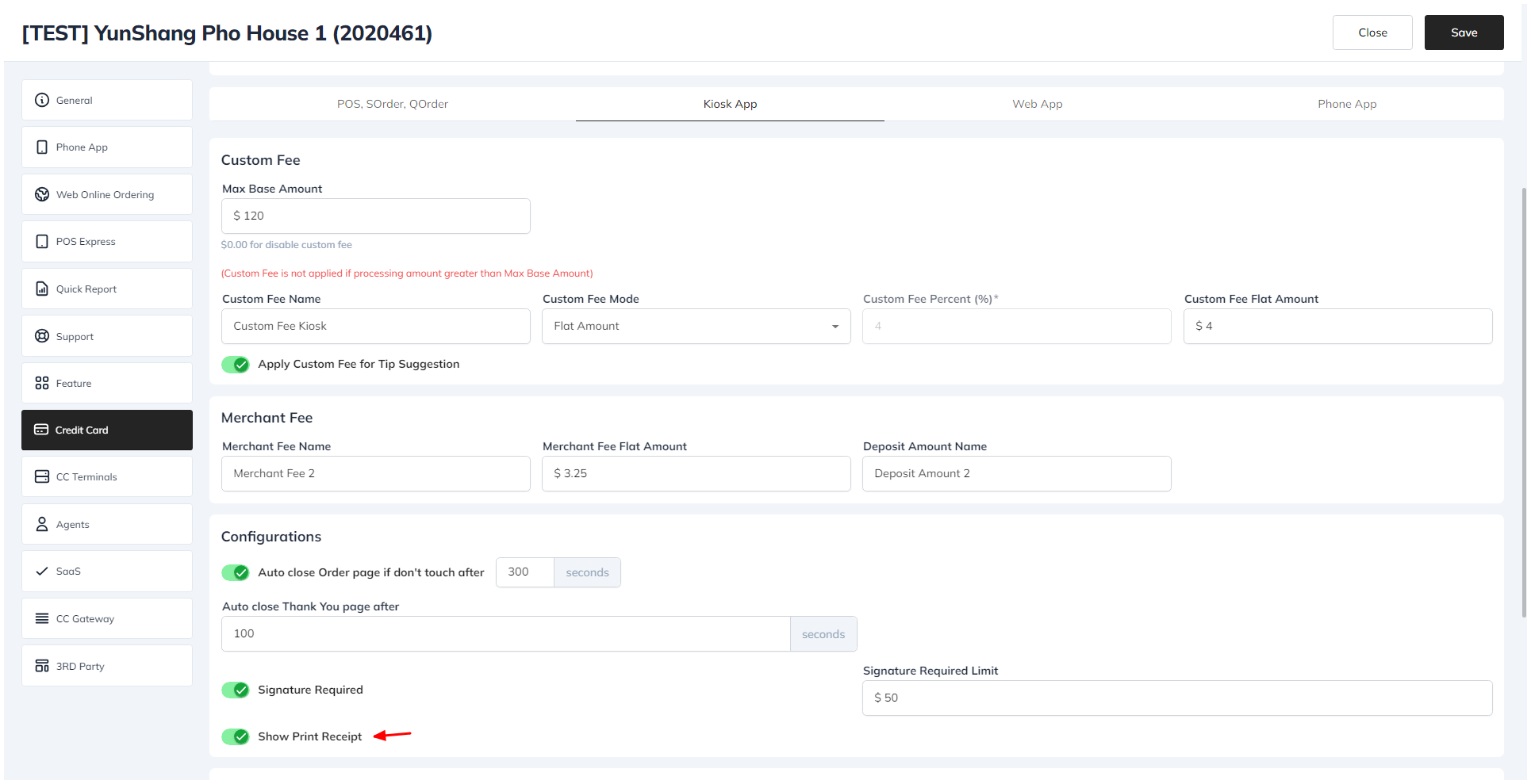 - In the Configurations section, enable the Show Print Receipt option.