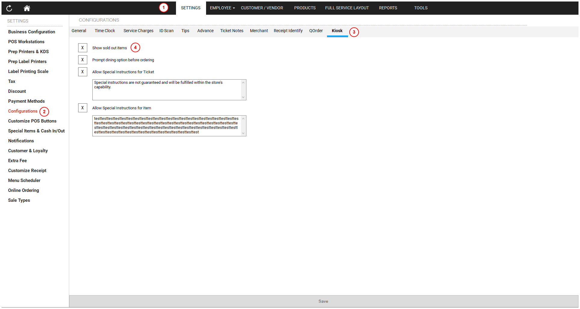 - Check the Allow Special Instruction for ticket (ticket) and Allow Special Instruction for item (item) options.
